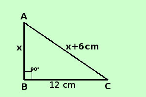 Perimetro = primo cateto + secondo cateto + ipotenusa lunghezza del primo cateto = AB = x lunghezza del secondo cateto = BC = 12 cm lunghezza dell'ipotenusa = AC = x + 6 cm Applico il Teorema di Pitagora al triangolo x2 + 122 = (x + 6)2 x2 + 144 = x2 + 12x + 36 x2 - x2 - 12x = 36 - 144 - 12x = - 108 x = 9 lunghezza del primo cateto = AB = x = 9 lunghezza del secondo cateto = BC = 12 lunghezza dell'ipotenusa = AC = x + 6 = 15 Perimetro = primo cateto + secondo cateto + ipotenusa = 9 + 12 + 15 = 36 cm |