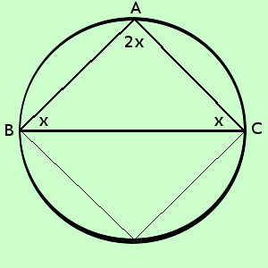 x = 45 Misura primo angolo = ABC = x = 45° Misura secondo angolo = BCA = x = 45° Misura terzo angolo = BAC = 2x = 90° Si tratta di un triangolo con angoli 45, 45 e 90 gradi , cioe' del triangolo rettangolo isoscele che e' meta' di un quadrato (se ribalto la figura attorno all'ipotenusa BC ottengo un quadrato) |
