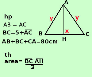 Per scrivere l'ipotesi scorro il testo e lo riscrivo in linguaggio geometrico: triangolo isoscele scrivo AB=AC supera di 5 il lato obliquo scrivo BC=5+AC il perimetro vale 80 scrivo AB+BC+CA=80 Scrivo il perimetro per esteso e ricordo che nel triangolo isoscele i lati obliqui sono uguali La tesi dice che devo trovare l'area, per trovare l'area ho bisogno della base AB e dell'altezza CH Come incognite mi conviene indicare la base ed il lato obliquo, una volta trovati i loro valori, mediante il teorema di Pitagora, posso trovare l'altezza del triangolo e calcolare l'area BC = x AC = AB = y " BC supera di 5 il lato obliquo" si scrive x = 5 + y "il perimetro vale 80 cm" si scrive x + y + y = 80 cm x + 2y= 80 Faccio il sistema
