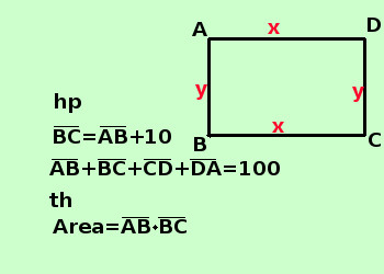 sviluppo Risolvere il seguente problema In un rettangolo la base supera l'altezza di cm 10, mentre il perimetro vale cm 100: trovare l'area del rettangolo ![]() A destra traccio la figura e scrivo l'ipotesi(hp) e la tesi(th) Per scrivere l'ipotesi scorro il testo e lo riscrivo in linguaggio geometrico: rettangolo: ripasso mentalmente le proprieta' la base supera l'altezza di 10 scrivo BC=10+AB il perimetro vale 100 scrivo AB+BC+CD+DA=100 Scrivo il perimetro per esteso e ricordo che nel rettangolo i lati opposti sono uguali La tesi dice che devo trovare l'area, per trovare l'area ho bisogno della base BC e dell'altezza AB Come incognite mi conviene indicare la base ed l'altezza: una volta trovati i loro valori posso calcolare l'area Ho 2 relazioni che posso coprire con 2 incognite x e y Nota: sempre tante relazioni quante sono le incognite: problemi a due incognite ti servono due relazioni; problemi a 3 incognite ti servono 3 relazioni, eccetera BC = DA = x AC = BD = y " la base supera l'altezza di cm 10" si scrive x = 10cm + y x = 10 + y "il perimetro vale 100 cm" si scrive x + y + x + y = 100 cm 2x + 2y= 100 x + y = 50 Faccio il sistema