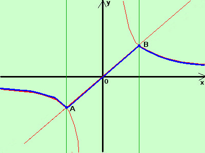 La prima parte della funzione e' un segmento di retta (bisettrice del primo e terzo quadrante) che devo tracciare nella striscia verticale di piano compresa fra le rette verticali x>=-1 ed x=1; tale segmento inizia dal punto A(-1;-1) e termina nel punto B(1;1) La seconda parte della funzione e' una iperbole equilatera riferita agli assi cartesiani; devo tracciarla nelle due striscie verticali di piano la prima a sinistra della retta verticale x=-1 e la seconda a destra della retta verticale x=1; nelle linee di separazione abbiamo che termina ed inizia nei punti A(-1;-1) e B(1;1)