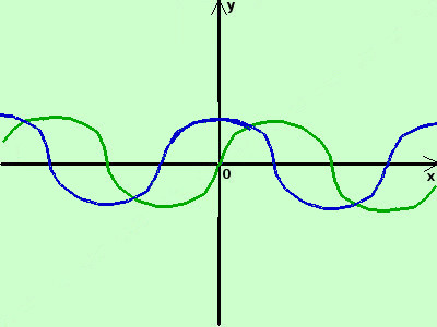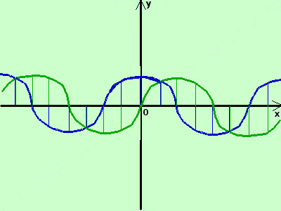 la prima e' la funzione seno (la disegno in verde) la seconda e' la funzione coseno (la disegno in blu) adesso sommo algebricamente in alcuni punti dell'asse x il valore delle due funzioni (in pratica sommo o sottraggo fra loro i segmenti verticali in verde ed i segmenti verticali in blu sulla stessa ascissa) ottengo i punti (in marrone)