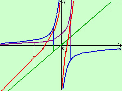 la prima e' la bisettrice del primo e terzo quadrante (la disegno in verde) la seconda e' l'opposta dell'iperbole equilatera riferita agli assi cartesiani (la disegno in blu) siccome questa funzione non e' definita per x=0 anche la funzione somma non sara' definita in tale punto la terza e' la funzione esponenziale (la disegno in viola) adesso sommo algebricamente in alcuni punti dell'asse x il valore delle due funzioni (in pratica sommo algebricamente fra loro i segmenti verticali in verde , in viola ed in blu sulla stessa ascissa) ottengo i punti (in marrone)