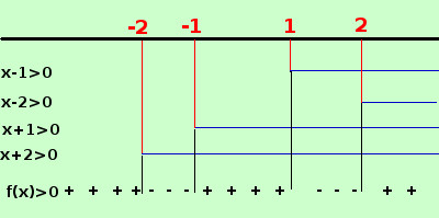 y = √(x4 - 5x2 + 4) devo porre il termine sotto radice maggiore od uguale a zero x4 - 5x2 + 4 ≥ 0 Devo trovare i valori dove la funzione e' positiva o nulla Per trovarli devo scomporrre il polinomio associato in fattori e studiare il segno del prodotto dei vari fattori trovati E' un trinomio x4 - 5x2 + 4; se sostituisco x2 con y ottengo un polinomio di secondo grado y2 - 5y + 4 ora posso scomporre come trinomio notevole: Devo trovare due numeri la cui somma sia -5 ed il prodotto sia +4: essi sono -1 e -4 quindi posso scrivere y2 - 5y + 4 = (y - 1)(y - 4) = al posto di y sostituisco x2 x4 - 5x2 + 4 = (x2 - 1)(x2 - 4) = ora scompongo come differenza di due quadrati ed ottengo = (x - 1)(x + 1)(x - 2)(x + 2) Ora pongo ogni fattore maggiore di zero e indico con una linea continua gli intervalli in cui il fattore e' positivo ![]() per x < -2 i quattro fattori sono negativi e quindi il loro prodotto e' positivo, cioe' la funzione f(x) e' positiva per -2 < x < -1abbiamo tre fattori negativied uno positivo, quindi il loro prodotto f(x) e' negativo per -1 < x < 1 abbiamo due fattori negativi e due positivi, quindi il loro prodotto f(x) e' positivo per 1 <x < 2abbiamo tre fattori positivi ed uno negativo, quindi il loro prodotto f(x) e' negativo per x > 2 i quattro fattori sono positivi e quindi il loro prodotto f(x) e' positivo per x=-2, x=-1, x=1, x=2 il prodotto f(x) vale zero quindi, siccome cerchiamo valori positivi o nulli, anche questi valori sono accettabili ottengo che la funzione e' positiva o nulla negli intervalli x ≤ -2 ∪ -1 ≤ x ≤ 1 ∪ x ≥ 2 quindi scrivo il campo di esistenza C.E. = { x ∈ R / x ≤ -2 ∪ -1 ≤ x ≤ 1 ∪ x ≥ 2 } Nota: Da notare che questi esercizi concettualmente sono semplici, il difficile e' utilizzare le conoscenze gia' acquisite nei precedenti anni di studio; se si trovano difficolta' occorre riprendere gli argomenti degli anni precedenti e ripassarli |