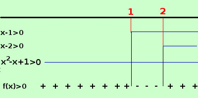 eseguo la divisione di Ruffini ed ottengo (x3-2x2+1)= (x - 1)(x2 - x + 1) quindi ho: x4 - 4x3 + 4x2 + x - 2 = (x-1)(x-2)(x2 - x + 1) il trinomio x2 - x + 1 non e' ulteriormente scomponibile x4 - 4x3 + 4x2 + x - 2 = (x-1)(x-2)(x2 - x + 1) ≥ 0 Ora pongo ogni fattore maggiore di zero e indico con una linea continua gli intervalli in cui il fattore e' positivo il trinomio x2 - x + 1 e' sempre positivo : basta provare a risolvere l'equazione associata e troverai che il discriminante e' sempre negativo ![]() per x < 1 abbiamo due fattori negativi ed uno positivo, quindi il loro prodotto f(x) e' positivo per 1 <x < 2abbiamo due fattori positivi ed uno negativo, quindi il loro prodotto f(x) e' negativo per x > 2 i tre fattori sono positivi e quindi il loro prodotto f(x) e' positivo per x=1, x=2 il prodotto f(x) vale zero quindi, siccome cerchiamo valori positivi o nulli, anche questi valori sono accettabili ottengo che la funzione e' positiva o nulla negli intervalli x ≤ 1 ∪ x ≥ 2 quindi scrivo il campo di esistenza C.E. = { x ∈ R / x ≤ 1 ∪ x ≥ 2 } |