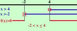 x - 4 --------- x + 2 Pongo sia il numeratore che il denominatore maggiori di zero (si fa sempre cosi' anche se devo trovare dove l'espressione e' minore od uguale a zero) x - 4 x + 2 Ho posto il numeratore maggiore od uguale a zero perche' stavolta devo cercare anche i valori dove l'espressione vale zero ed una frazione e' zero quando sopra (il numeratore) e' zero. Invece il denominatore non potra' mai essere uguale a zero Risolvo x x faccio lo schema x x f(x) + + + + ]-2[ - - - - - - (4) + + + + + + + + + f(x) indica l'espressione di partenza La parentesi tonda indica che l'espressione si annulla nel punto mentre la quadra indica che il valore non e' accettabile ]-2[ non e' accettabile perche' annulla il denominatore e non si puo' mai dividere per zero Io devo cercare dove l'espressione e' negativa o nulla e questo succede per x maggiore di - 2 ed x minore od uguale a 4 -2 oppure in altra notazione |