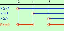 x2 - 3x - 10 --------------- x - 1 Pongo sia il numeratore che il denominatore maggiori di zero, anzi il numeratore maggiore od uguale a zero ed il denominatore solo maggiore di zero x2 - 3x - 10 x - 1 Non avendo ancora fatte le disequazioni di secondo grado scompongo il numeratore, ottengo (x+2)(x-5) quindi risolvendo tutto x + 2 x - 5 x - 1 calcolando x x x faccio lo schema x x x f(x) - - - - - (-2) + + + + ]1[ - - - - - - (5) + + + + + + + se hai bisogno di aiuto per leggere lo schema La parentesi tonda indica che l'espressione si annulla nel punto mentre la quadra indica che il valore non e' accettabile Io devo cercare dove l'espressione e' positiva o nulla e questo succede tra -2 ed 1 e oltre 5 -2 oppure in altra notazione |