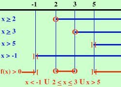 x2 - 5x + 6 --------------- x2 - 4x - 5 Pongo sia il numeratore che il denominatore maggiori di zero, anzi il numeratore maggiore od uguale a zero ed il denominatore solo maggiore di zero x2 - 5x + 6 x2 - 4x - 5 Non avendo ancora fatte le disequazioni di secondo grado scompongo sia il numeratore che il denominatore, ottengo (x - 2)(x - 3) (x - 5)(x + 1) quindi pongo ogni fattore maggiore di zero x - 2 x - 3 x - 5 x + 1 calcolando x x x x faccio lo schema x x x x f(x) + + + + ]-1[ - - - - - (2) + + + + (3) - - - - - -]5[ + + + + + se hai bisogno di aiuto per leggere il grafico La parentesi tonda indica che l'espressione si annulla nel punto mentre la quadra indica che il valore non e' accettabile Io devo cercare dove l'espressione e' positiva o nulla e questo succede prima di -1 poi tra 2 e 3 ed infine oltre 5 x oppure in altra notazione |