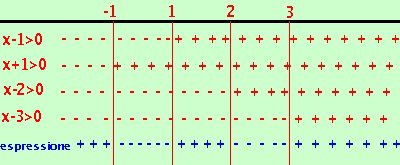 Adesso riporto i risultati su un grafico indicando con un un + dove ogni disequazione e' verificata e con un - dove non e' verificata e faccio il conto dei segni:devo prendere gli intervalli dove il prodotto dei segni dei fattori (cioe' il segno dell'espressione) risulta positivo. Ottengo come risultato: x < -1 U 1 < x < 2 U x > 3 |
