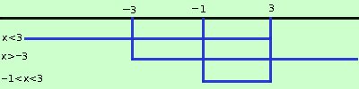 -1 < x < 3 Mettendo assieme questa relazione con le condizioni per la realta' dei logaritmi ho il sistema x > -3 -1 < x < 3 Riporto i dati su un grafico, e prendo i valori comuni a tutte le disequazioni indico i valori accettabili con una linea continua