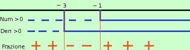 Se hai bisogno di un ripasso Numeratore: 3x + 3 > 0 Denominatore:2x + 6 >0 ottengo Numeratore positivo: x > -1 Denominatore positivo: x > -3 Faccio il grafico indico i valori positivi con una linea continua ed indico i negativi con una linea tratteggiata: Per sapere il segno della frazione controllo i segni con la regola del prodotto (la regola dei segni e' la stessa per il prodotto ed il quoziente)