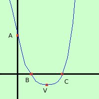 Rappresentare graficamente la parabola di equazione y = x2 - 4x + 3 1) Vertice Il vertice ci e' stato dato con il problema V = (2; -1) 2) troviamo l'intersezione con l'asse y e' sufficiente prendere come prima coordinata 0 e come seconda coordinata il termine noto della parabola A = (0; 3) Anche questo era fra i dati del problema 3) troviamo le intersezioni B ed C con l'asse x, se esistono Devo fare il sistema fra la parabola e l'equazione dell'asse x (y=0) y = 0 sostituisco y = 0 ottengo le soluzioni calcoli