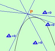 Quando farai analisi matematica vedrai un metodo diverso molto piu' semplice, ma, per ora, devi applicare il metodo del determinante ![]() Presa una parabola ed un punto esterno alla parabola stessa considereremo il fascio di rette nel punto e fra queste rette sceglieremo quelle che hanno due punti coincidenti comuni con la parabola, cioe' quelle che messe a sistema con la parabola ci forniscono due soluzioni coincidenti, ossia il delta del sistema fra fascio di rette e parabola deve essere uguale a zero Dai anche un'occhiata a questo link se il delta e' minore di zero la retta e' esterna rispetto alla parabola e le due soluzioni del sistema sono complesse e coniugate se il delta e' maggiore di zero la retta taglia la parabola in due punti e le due soluzioni del sistema sono reali e distinte se il delta e' uguale a zero la retta e' tangente alla parabola e le due soluzioni del sistema sono reali coincidenti Esercizio 1 Data la parabola y= x2 - 6x + 5 trovare le equazioni delle tangenti condotte alla parabola dal punto A(2,4) Soluzione Esercizio 2 Data la parabola y= -x2 - 6x trovare le equazioni delle tangenti condotte alla parabola dal punto A(4,0) e determinarne i punti di tangenza Soluzione Esercizio 3 Data la parabola y= x2 + 1 trovare le equazioni delle tangenti condotte alla parabola dall'origine O(0,0) e, indicati con A e B i punti in cui tali tangenti toccano la parabola, trovare l'area del triangolo OAB Soluzione |