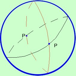 E' una delle piu' strane, ma piu' vicina delle altre alla geometria del mondo reale consideriamo come piano la superficie di una sfera consideriamo come punto l'insieme di due punti opposti sulla sfera (polo nord e sud assieme formano un punto) consideriamo come retta un qualunque cerchio massimo, (cioe' tipo l'equatore). Con queste convenzioni valgono tutti i postulati eccetto il quinto: infatti due rette qualunque sulla sfera avranno sempre un punto in comune: dove i cerchi si tagliano ![]() In questa geometria da un punto non si puo' mandare nessuna retta parallela |