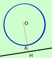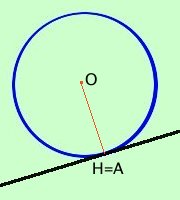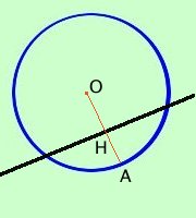 Vediamo ora come si puo' caratterizzare la diversa posizione di una retta rispetto ad una circonferenza utilizzando la distanza fra il centro della circonferenza e la retta: Abbiamo tre possibilita' 1 retta esterna alla circonferenza ![]() OH > OA d > r La retta e' esterna alla circonferenza se la distanza OH della retta dal centro della circonferenza e' superiore al valore del raggio OA Viceversa: se la distanza di una retta dal centro della circonferenza e' superiore al valore del raggio allora la retta e' esterna alla circonferenza 2 retta tangente alla circonferenza ![]() OH = OA d = r La retta e' Tangente alla circonferenza se la distanza OH della retta dal centro della circonferenza e' uguale al valore del raggio OA Viceversa: se la distanza di una retta dal centro della circonferenza e' uguale al valore del raggio allora la retta e' tangente alla circonferenza 3 retta secante la circonferenza ![]() OH < OA d < r La retta e' secante la circonferenza se la distanza OH della retta dal centro della circonferenza e' inferiore al valore del raggio OA Viceversa: se la distanza di una retta dal centro della circonferenza e' inferiore al valore del raggio allora la retta e' secante la circonferenza |