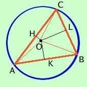 Definiamo circocentro di un triangolo il punto di incontro degli assi dei suoi lati ![]() Il circocentro e' il centro della circonferenza circoscritta al triangolo Mostriamo che gli assi dei lati di un triangolo passano tutti per lo stesso punto e che tale punto e' il centro della circonferenza circoscritta. Consideriamo l'asse KO del segmento AB e l'asse LO del segmento BC, essi si incontreranno in un punto O: Per definizione di asse del segmento AB avremo AO = BO Per definizione di asse del segmento BC avremo BO = CO Per la proprieta' transitiva della congruenza avremo che AO = CO Quindi per definizione di asse del segmento il punto O e' sull'asse del segmento AC Considerando i tre segmenti congruenti AO, BO, CO come raggi potremo tracciare la circonferenza di centro O circoscritta al triangolo, come volevamo Viceversa, se O e' il centro della circonferenza circoscritta al triangolo ABC essendo OA = OB = OC perche' raggi, avremo che O appartiene agli assi dei segmenti AB, BC ed AC sempre per la definizione di asse di un segmento |