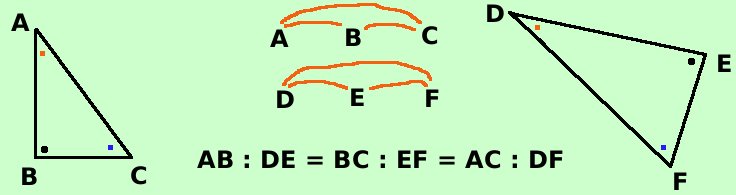 Una delle difficolta' che si incontrano quando si risolve un problema sui triangoli simili e' il mettere correttamente in proporzione i lati omologhi: non sempre e' facile da una figura, spesso fatta frettolosamente e con poca corrispondenza ai dati, vedere quale e' la proporzione esatta da considerare Fortunatamente e' possibile elaborare un metodo semplice per scrivere bene la proporzione: i lati proporzionali sono di fronte agli angoli uguali Quindi, considerati ad esempio i triangoli simili ABC e DEF ti conviene considerare gli angoli uguali e scriverli ognuno sopra il suo uguale e poi mettere in proporzione i lati opposti a tali angoli: in pratica basta prendere sia sopra che sotto le stesse lettere ![]() Se collego B con C allora collego anche E con F e quindi scrivo BC:EF Se collego A con C allora collego anche D con F e quindi scrivo AC:DF Vediamo come comportarci su un esempio abbastanza complicato, che capita in parecchi problemi: Consideriamo il triangolo rettangolo ABC retto in A, e, dal punto A tracciamo la perpendicolare al lato BC sino ad incontrarlo nel punto H: