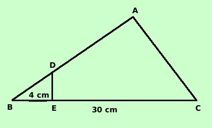 Prima troviamo le tre dimensioni del triangolo ABC, poi mostriamo che ABC e BDE sono simili e siccome di BDE conosciamo un lato potremo impostare la proporzione per trovarne gli altri due lati. Pongo AC = x avro' AB = 4/3 x Per trovare il valore della x applico il teorema di Pitagora al triangolo ABC BC2 = AB2 + BC2 302 = (4/3 x)2 + x2 900 = 16/9 x2 + x2 900 = 25/9 x2 x2 = 900 · 9/25 per trovare la x faccio la radice quadrata dei due termini x = 30 · 3/5 x = 18 cm Ottengo quindi AC = 18 cm __ AB = 4/3 · 18 = 24 cm __ Quindi del triangolo ABC conosco i tre lati I triangoli ABC e DBE sono simili perche': l'angolo in B e' in comune gli angoli BAC e BED sono congruenti perche' retti Quindi per il primo criterio di similitudine i due triangoli sono simili e posso scrivere la proporzione BC : BD = AC : DE = AB : BE 30 : BD = 18 : DE = 24 : 4 Consideriamo la proporzione formata dal primo e dal terzo termine e troviamo il valore di BD 30 : BD = 24 : 4