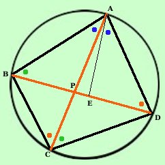 Teorema: Per ogni quadrilatero inscritto in una circonferenza la somma dei prodotti delle misure dei lati opposti e' uguale al prodotto della misura delle due diagonali ![]() AB · CD + BC · AD = AC · BD Dimostrazione: Dal lato AD del quadrilatero riporto il segmento AE in modo che l'angolo EAD sia congruente all'angolo BAC Considero i due triangoli BAC e AED, essi hanno: BCA = EDA^^ perche' angoli alla circonferenza che insistono sullo stesso arco BC (se prolungo ED ....) BAC = EAD^^ per costruzione: Quindi i due triangoli BAC ed AED sono simili per il primo criterio di similitudine e posso scrivere: Te li ordino secondo gli angoli per scrivere meglio la proporzione
