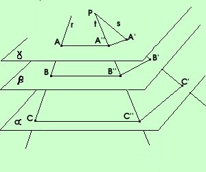 sono sghembein tal caso posso considerare sulla retta s un punto P e considerare dal punto P una retta t che sia complanare ad r e quindi sul piano individuato dalle rette r e t vale il teorema di Talete: AB : BC = A"B" : B"C" inoltre le due rette t ed s,avendo il punto P in comune sono complanari e per il piano da loro individuato vale il teorema di Talete A"B" : B"C" = A'B' : B'C' Per la proprieta' transitiva segue la tesi AB : BC = A'B' : B'C' |