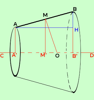 ![]() M e' il punto medio di AB O e' il punto di intersezione dell'asse del segmento AB con l'asse di rotazione CD In pratica in questo caso si tratta di un tronco di cono di altezza A'B', apotema AB e raggi AA' e BB' quindi abbiamo, per la superficie di rotazione Area laterale = π AB · (AA' + BB') Considero il trapezio AA'B'B, traccio per M la parallela a BB', ottengo MM'; essendo M il punto medio di AB ne deriva che M' e' il punto medio di A'B' e che MM' = (AA'+BB')/2 E' una dimostrazione piuttosto semplice che potresti fare come esercizio; se vuoi puoi vedere qui la dimostrazione nella formula di partenza moltiplico e divido per 2 (tanto non cambia niente) per poter operare la sostituzione Area laterale = 2 π AB · (AA' + BB')/2 = 2 π AB · MM' Ora considero i triangoli MM'O e AHB essi hanno: MM'O=AHB ^ ^ perche' retti M'MO=HAB ^ ^ perche'angoli con lati fra loro perpendicolari M'M⊥AH e MO⊥AB Allora i tre angoli sono uguali ed essendo MOM' simile a AHB, per il primo criterio di similitudine, posso scrivere la proporzione MM' : AH = OM : AB so che AH = A'B' MM' : A'B'= OM : AB applico la proprieta' fondamentale (prodotto dei medi uguale al prodotto degli estremi) AB·MM' = MO·A'B' sostituiamo nell'espressione dell'area trovata prima Area laterale = 2 π AB · MM' = 2π MO · A'B' cioe' Area laterale = 2π OM · A'B' come volevamo |