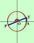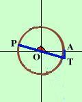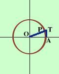 ![]() Dobbiamo immaginare che il raggio OP parta dall'orizzontale OA e che il punto P percorra la circonferenza Leggiamo il valore del segmento AT sulla verticale Per vedere quanto vale prendiamo angoli molto vicini al valore considerato e controlliamo sul grafico il valore di OH