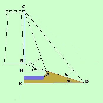 ![]() Conosciamo La distanza AD L'angolo ![]() L'angolo ![]() L'angolo ![]() Essendo i triangoli ABH e DBK simili avro' inoltre che angolo BAH = angolo BDK = ![]() Al solito possiamo misurare AD con un decametro a nastro e gli angoli mediante il teodolite se considero il triangolo ACD in esso l'angolo BAC e' un angolo esterno e quindi uguale alla somma degli angoli interni non adiacenti BAC = ADC + ACD e quindi, ricavando ACD ACD = BAC - ADC = ![]() ![]() Quindi se considero il triangolo CAD ne conosco due angoli ed un lato e quindi posso risolverlo: possiamo calcolare AC con il teorema dei seni