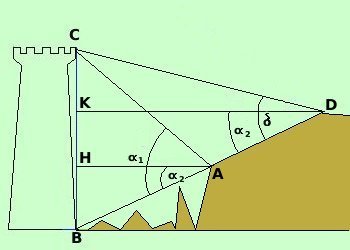 ![]() Conosciamo La distanza AD L'angolo ![]() L'angolo ![]() L'angolo ![]() Considerando i triangoli simili ABH e DBK avro' inoltre che angolo BAH = angolo BDK = ![]() Al solito possiamo misurare AD con un decametro a nastro e gli angoli mediante il teodolite se considero il triangolo ACD in esso l'angolo BAC e' un angolo esterno e quindi uguale alla somma degli angoli interni non adiacenti BAC = ADC + ACD e quindi, ricavando ACD ACD = BAC - ADC = ![]() ![]() Quindi se considero il triangolo CAD ne conosco due angoli ed un lato e quindi posso risolverlo: possiamo calcolare AC con il teorema dei seni