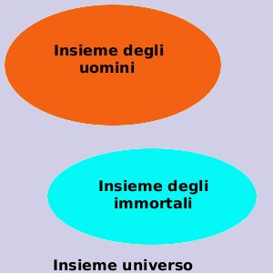 Considero gli insiemi P(x) = { x : x e' un uomo } Q(x) = { x : x e' immmortale } considero la negazione della seconda Q(x)___= { x : x non e' immmortale } la scrittura implica che l'insieme P(x) e' contenuto nell'insieme complementare di Q(x) quindi e' vera solamente se P(x) non ha elementi comuni con Q(x); equivale a dire che P(x) e Q(x) sono insiemi disgiunti P(x) Come avrai notato la negazione di una proposizione corrisponde al complementare dell'insieme collegato |