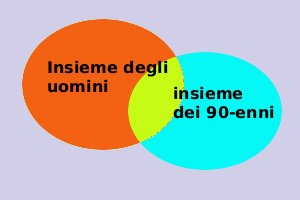 Considero gli insiemi P(x) = { x : x e' un uomo } Q(x) = { x : x ha 90 anni } considero la negazione della seconda Q(x)___= { x : x non ha 90 anni } la scrittura implica che l'oggetto x e' contenuto nell'insieme P(x) e non e' contenuto nell'insieme Q(x) quindi e' vera solamente se x appartiene alla differenza fra P(x) e Q(x) x In figura e' in rosso la parte che ci interessa (gli uomini che non sono novantenni) |