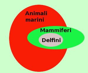 mediante i diagrammi di Eulero-Venn I delfini appartengono all'insieme degli animali marini l'insieme dei mammiferi ha elementi comuni coll'insieme degli animali marini quindi otteniamo la figura a destra ed il ragionamento e' valido avendo l'insieme degli animali marini e dei delfini degli elementi comuni Ho visto sull'enciclopedia che esistono anche delfini non animali marini ma fluviali; puoi variare l'esempio scrivendo il primo come qualche delfino e' un animale marino Vediamo anche un esempio di sillogismo non valido: ![]()