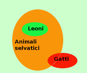 tutti i leoni sono selvatici significa: { leoni }⊂{ selvatici} qualche gatto e' selvatico significa: { gatti } ∩ { selvatici } ≠ ∅ Qualche leone e' un gatto significa: { leoni } ∩ { gatti } ≠ Ø falso e siccome l'insieme dei gatti e dei leoni non hanno elementi comuni il ragionamento e' falso mediante i diagrammi di Eulero-Venn i 3 giudizi dicono: L'insieme dei leoni e' contenuto nell'insieme degli animali selvatici vero L'insieme dei gatti ha qualche elemento in comune con l'insieme degli animali selvatici vero (esiste il gatto selvatico europeo, inoltre parecchi gatti sono randagi) L'insieme dei leoni e l'insieme dei gatti hanno qualche elemento in comune falso Otteniamo la figura a destra ed il ragionamento non e' valido essendo l'insieme dei leoni e l'insieme dei gatti disgiunti |