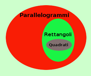 mediante i diagrammi di Eulero-Venn L'insieme dei quadrati e dei parallelogrammi hanno elementi in comune (vero: l'insieme dei quadrati e' addirittura contenuto nell'insieme dei parallelogrammi) l'insieme dei rettangoli ha elementi comuni coll'insieme dei parallelogrammi (vero: l'insieme dei rettangoli e' addirittura contenuto nell'insieme dei parallelogrammi) quindi otteniamo la figura a destra ed il ragionamento e' valido avendo l'insieme dei quadrati e l'insieme dei rettangoli degli elementi comuni (l'insieme dei quadrati e' addirittura contenuto nell'insieme dei rettangoli) Vediamo anche un esempio di sillogismo non valido: ![]()