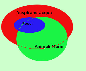 mediante i diagrammi di Eulero-Venn L'insieme dei pesci e deglii animali marini hanno elementi in comune (vero) l'insieme degli animali marini ha elementi comuni coll'insieme degli animali che respirano acqua (vero) quindi otteniamo la figura a destra ed il ragionamento e' valido avendo l'insieme degli animali che repirano acqua e l'insieme dei pesci degli elementi comuni (l'insieme dei pesci e' addirittura contenuto nell'insieme degli animali che respirano acqua) Vediamo anche un esempio di sillogismo non valido: ![]()
