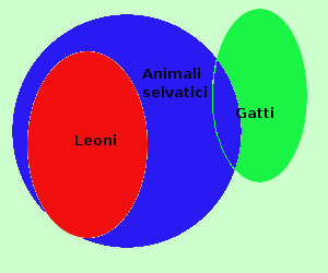 nessun leone e' un gatto significa: { gatti }∩{ leoni } = Ø qualche gatto e' un animale selvatico significa: { gatti } ∩ { animale selvatico } ≠ ∅ Nessun animale selvatico e' un leone significa { animale selvatico } ∩ { leone } = Ø falso e siccome gli animali selvatici e l'insieme dei leoni hanno elementi comuni il ragionamento e' falso mediante i diagrammi di Eulero-Venn i 3 giudizi dicono: L'insieme dei leoni non ha elementi comuni con l'insieme dei gatti vero L'insieme dei gatti ha qualche elemento in comune con l'insieme degli animali selvatici vero L'insieme degli leoni e l'insieme degli animali selvatici non hanno elementi in comune falso Otteniamo la figura a destra ed il ragionamento non e' valido non essendo l'insieme degli animali seivatici e l'insieme dei leoni disgiunti |