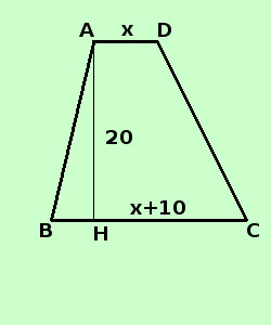 lunghezza base minore = AD = x lunghezza base maggiore = BC = x + 10 cm misura dell'altezza = AH = 20cm conosco il valore dell'area
