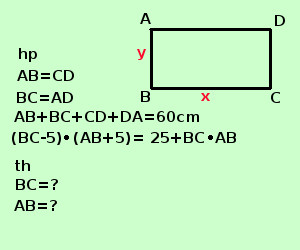 Per scrivere l'ipotesi scorro il testo e lo riscrivo in linguaggio geometrico: rettangolo scrivo AB=CD e BC=DA "perimetro 60cm" scrivo AB+BC+CD+DA=60 "se aumento di cm 5 l'altezza e diminuisco di cm 5 la base l'area aumenta di 25" scrivo (AB+5)·(BC-5)=BC·AB +25 La tesi dice che devo trovare l'area, per trovare l'area ho bisogno della base BC e dell'altezza AB Come incognite, mi conviene indicare la base e l'altezza, una volta trovati i loro valori, moltiplicandoli trovero' l'area BC=x AB = y " perimetro 60cm" si scrive 2x + 2y = 60 x + y = 30 "se aumento di cm 5 l'altezza e diminuisco di cm 5 la base l'area aumenta di 25" si scrive (l'area vale xy) (y + 5)·(x - 5) = xy + 25 xy - 5y + 5x - 25 = xy + 25 5x - 5y = 50 x - y = 10 Faccio il sistema