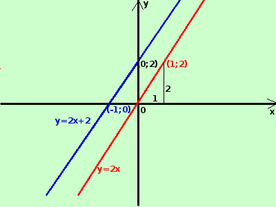 Curva in rosso E' la funzione retta passante per l'origine degli assi: per ogni incremento in orizzontale ho un incremento doppio in verticale (se x cresce di 1 la y cresce di 2) Passa per l'origine degli assi perche' non ha il termine noto Curva in blu (retta qualunque nel piano) y = 2x + 2 se ho un termine noto positivo la precedente retta per l'origine viene tutta spostata verso l'alto per quel valore (se fosse negativo si sposterebbe verso il basso) nel nostro caso il punto che passava per l'origine ora passa per il punto (0;2) a destra la sua rappresentazione grafica Per rappresentare una retta nel piano basta considerare due suoi punti qualunque che puoi trovare assegnando un valore ad x e calcolare il relativo valore di y esempio, per rappresentare y=2x+2 assegno ad x il valore 0 ottengo y=2·0 + 2 → y = 0 + 2 = 2 il primo punto e' (0;2) assegno ad x il valore -1 ottengo y=2·(-1) + 2 → y = -2 + 2 = 0 il secondo punto e' (-1;0) traccio la retta (blu) passante per quei due punti Naturalmente scelgo sempre i punti piu' semplici da calcolare |