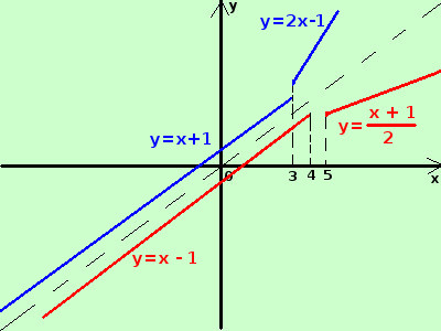 E' una normalissima funzione, composta da parti diverse in intervalli diversi, utilizzeremo spesso in analisi tali funzioni "spezzate" La funzione e' definita su tutto ℜ Sia la prima parte che la seconda rappresentano delle semirette e precisamente y = x + 1 per x < 3 e' una semiretta di origine il punto (3;4) nel verso delle x decrescenti y = 2x - 1 per x ≥ 3 e' una semiretta di origine il punto (3;5) nel verso delle x crescenti trovo quindi l'inversa per le semirette: considero la prima y = x + 1 con D = {x ∈ ℜ / x < 3} il valore 3 per x corrisponde al valore 4 per y: la semiretta ha origine nel punto (3;4) per trovarne l'inversa scambio tra loro x ed y x = y + 1 ricavo la y ed ottengo y = x - 1 con D = {x ∈ ℜ / x < 4} considero la seconda y = 2x - 1 con D = {x ∈ ℜ / x ≥ 3} il valore 3 per x corrisponde al valore 5 per y: la semiretta ha origine nel punto (3;5) per trovarne l'inversa scambio tra loro x ed y
