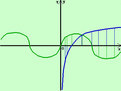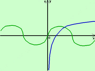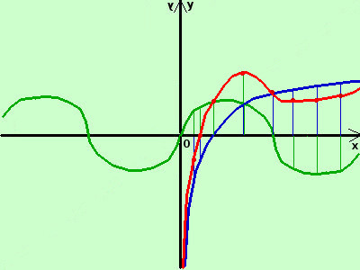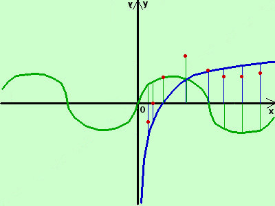 la prima e' la funzione seno (la disegno in verde) la seconda e' la funzione logaritmo naturale (la disegno in blu) poiche' il dominio di y2 = log x e' limitato allora la funzione somma avra' dominio limitato coincidente con quello di y2 = log x, cioe D={x∈ℜ / x > 0} adesso sommo algebricamente in alcuni punti dell'asse x il valore delle due funzioni (in pratica sommo o sottraggo fra loro i segmenti verticali in verde ed i segmenti verticali in blu sulla stessa ascissa) ottengo i punti (in marrone)