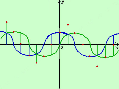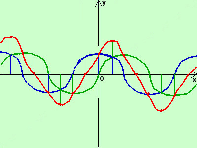 la prima e' la funzione seno (la disegno in verde) la seconda e' la funzione coseno (la disegno in blu) adesso sommo algebricamente in alcuni punti dell'asse x il valore delle due funzioni (in pratica sommo o sottraggo fra loro i segmenti verticali in verde ed i segmenti verticali in blu sulla stessa ascissa) ottengo i punti (in marrone)