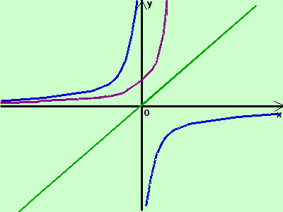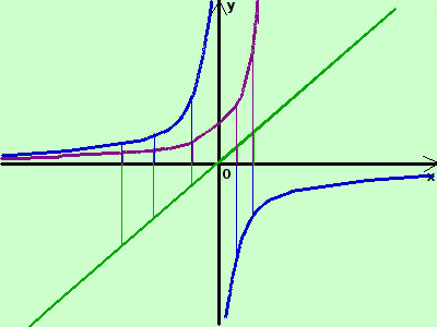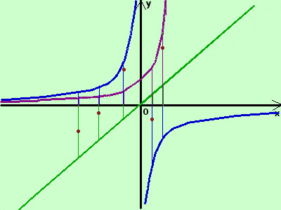 la prima e' la bisettrice del primo e terzo quadrante (la disegno in verde) la seconda e' l'opposta dell'iperbole equilatera riferita agli assi cartesiani (la disegno in blu) siccome questa funzione non e' definita per x=0 anche la funzione somma non sara' definita in tale punto la terza e' la funzione esponenziale (la disegno in viola) adesso sommo algebricamente in alcuni punti dell'asse x il valore delle due funzioni (in pratica sommo algebricamente fra loro i segmenti verticali in verde , in viola ed in blu sulla stessa ascissa) ottengo i punti (in marrone)