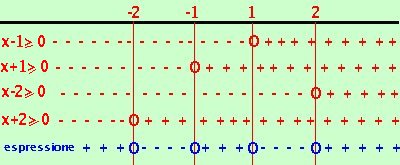 risolviamo la disequazione: x4 - 5x2 +4 Considero il polinomio associato x4 - 5x2 +4 = devo scomporlo in fattori; sono 3 termini, se faccio la sostituzione x2 = y ottengo x2 - 5x +4 = questo posso scomporlo come trinomio notevole x2 - 5x +4 = (y - 1)(y - 4) ora rimetto x2 al posto di y x4 - 5x2 +4 = (x2 - 1)(x2 - 4) Ora devo decidere se voglio fare la disequazione con fattori di secondo grado oppure solo con fattori di primo grado scomponendo anche gli ultimi fattori tra parentesi. Un metodo vale l'altro: noi utilizzeremo fin dove possibile fattori di primo grado Dentro parentesi sono due termini e precisamente la differenza fra due quadrati cioe' x2 - 1 =(x - 1)(x + 1) x2 - 4 =(x - 2)(x + 2) e quindi avro': x4 - 5x2+ 4 = (x - 1)(x + 1)(x - 2)(x + 2) > 0 poniamo ogni fattore maggiore di zero