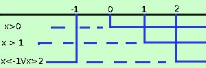 x(x-1) > 2 e, facendo i calcoli x2 - x > 2 x2 - x - 2 > 0 Mettendo assieme questa relazione con le condizioni per la realta' dei logaritmi devo risolvere il sistema Si potrebbe anche risolvere "a pezzi": prima le condizioni di realta' poi quest'ultima disequazione, ma, secondo me, e' piu' conveniente il sistema x - 1 > 0 x2 - x - 2 > 0 Calcoli Ottengo x > 1 x <-1 V x > 2 Riporto i dati su un grafico e prendo i valori comuni a tutte le disequazioni indico i valori accettabili con una linea continua ed indico i non accettabili con una linea tratteggiata