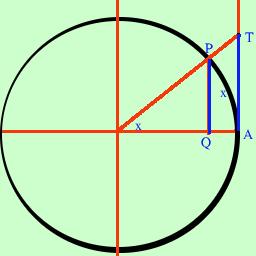 di conseguenza il nostro limite varra' 1Consideriamo questa disuguaglianza sen x<x<tang x che, come si puo' vedere dalla figura e' valida essendo PQ (sen x) minore dell'arco x che a sua volta e' minore di AT (tang x), ora se divido tutto per senx (e posso farlo senza cambiare niente perche' e' positivo) otterro' sen x/sen x < x/sen x < tang x/sen x semplificando 1 < x/sen x < 1/cos x Ora invertendo i termini basta cambiare di verso alle disuguaglianze 1 > (sen x)/x > cos x ora abbiamo limx->0 1 = 1 e limx->0 cos x = 1 da cio' segue che anche per quella in mezzo limx->0 senx/x = 1 |