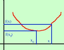 comincia a risalireMatematicamente dovremo dire che quel punto e' piu' basso, cioe' il suo valore e' inferiore a quello negli altri punti In formule: la funzione y = f(x) avra' un punto di minimo nel punto x0 se f(x0 ) per ogni x appartenente ad un intorno completo di x0 come prima anche qui si puo' dire che se la funzione e' continua e derivabile in un intorno completo di x0 allora la tangente in x0 sara' orizzontale, cioe' la derivata avra' valore zero Curiosita': anche qui per la definizione data una retta orizzontale sarebbe composta da tutti punti di minimo, infatti il valore in ogni punto e' uguale a tutti gli altri valori. Per ovviare all'inconveniente, si puo' definire il minimo con la diseguaglianza stretta ( < ) invece che con il Qualche libro per distinguere parla di minimo proprio ed improprio. Ti consiglio di seguire la definizione del tuo libro di testo |