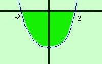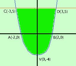 Tale area e' in parte sopra ed in parte sotto l'asse delle x, quindi studiamole nei particolari: ![]() Per fare l'area sotto l'asse x bastera' fare l'integrale della parabola da -2 a 2 e cambiarlo di segno Per fare l'area sopra l'asse delle x prima faremo l'integrale da -3 a 3 della retta e poi toglieremo l'area compresa fra la parabola e l'asse x da -3 a -2 e anche da 2 a 3