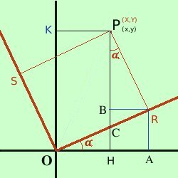 sono ruotati attorno all'origine rispetto ai vecchi assi dell'angolo αAllora osserva la figura: dobbiamo trovare il segmento OH (x) utilizzando le nuove coordinate X e Y calcoleremo OH come differenza fra OA ed AH Considerando il triangolo OAR per i teoremi sui triangoli rettangoli in trigonometria abbiamo OA = OR cos α = X cos α Ora considero il triangolo PBR essendo BR = HA; l'angolo BPR vale α per i teoremi sui triangoli rettangoli in trigonometria abbiamo AH = BR = PR sen α = Y sen α quindi abbiamo OH = OA - AH = X cos α - Y sen α quindi posso scrivere x = X cos α - Y sen α Troviamo la formula equivalente per la y Osserva la figura a destra: dobbiamo trovare il segmento OK (y) utilizzando le nuove coordinate X e Y