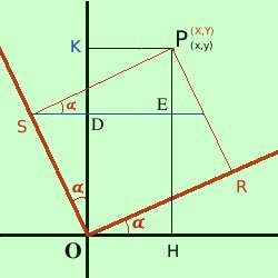 DKConsiderando il triangolo ODS per i teoremi sui triangoli rettangoli in trigonometria abbiamo OD = OS cos α = Y cos α Ora considero il triangolo PES essendo PE = KD; l'angolo PSE vale α per i teoremi sui triangoli rettangoli in trigonometria abbiamo KD = PE = PS sen quindi abbiamo OK = OD + DK = X sen α + Y cos α quindi posso scrivere y = X sen α + Y cos α Poiche' negli esercizi dovremo sostituire le nuove coordinate alle vecchie conviene considerare solamente le formule con prima dell'uguale le vecchie coordinate; Raccogliendo, le equazioni per la rotazione di coordinate saranno