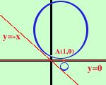 Trovare l'equazione della circonferenza passante per il punto A(1,0) e tangente alle rette y = 0 y = -x E' difficile incontrare un problema del genere per le difficolta' di calcolo che si incontrano: infatti la tangenza ad una retta si traduce in una condizione di secondo grado, quindi l'equazione risolvente sara' generalmente di quarto grado, noi facciamo un caso particolare Prendo l'equazione generica della circonferenza x2+ y2 + ax + by + c = 0